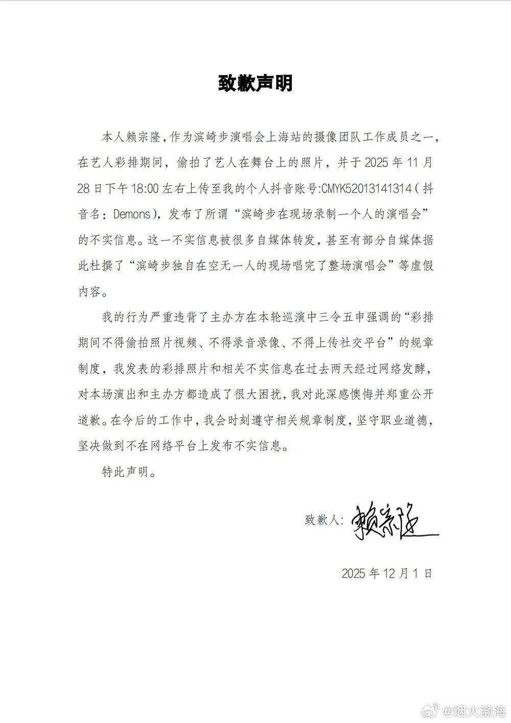 12月1日,滨崎步演唱会上海站摄像团队工作成员赖永隆在微博发布致歉声明,提到,网传11月28日滨崎步在上海演唱会取消后,面对空荡荡的舞台一人独唱的视频,为艺人彩排期间赖永隆偷拍的照片,赖永隆同时提到,当时自己发布的所谓“滨崎步在现场录制一个人的演唱会”,为“不实信息”。